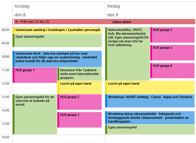 Så här ser planeringen ut för konf.dagarna – om eventuella ändringar görs så kommer de att synas direkt i den gemensamma kalendern. Grupperna för HLR-utbildningen ser ni i mail från Erik J den 22/12.